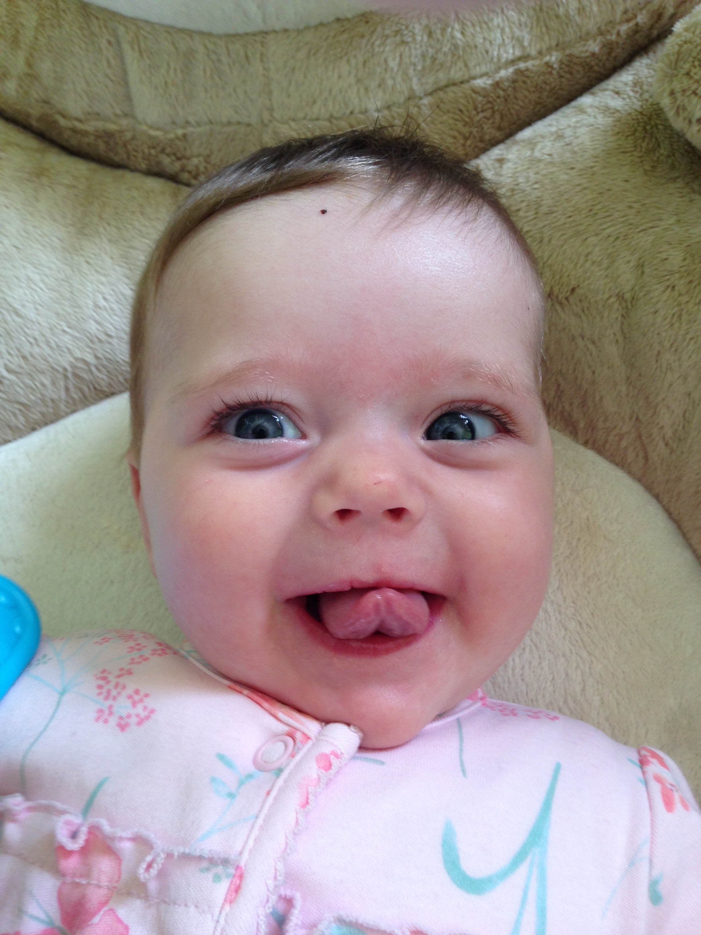I have made what I consider to be a good ‘friend’ on this journey. She’s my text-friend and her baby is around the same age as you were when you were diagnosed. She is still early on in her journey, and she’s got some stuff to deal with right now that we can be lucky we didn’t have to worry about. I was upset this morning and texted her a few times about how I was feeling. I was sad because I’d left you alone playing on your mat while I ran around tidying and cleaning, and when I came to see you, you had fallen asleep. I felt like a terrible parent a) for leaving you, b) for missing out on an opportunity to play with you for the sake of catching up on some ironing, and c) for the fact that you were alone when you fell asleep. She said something that made me smile through this cloud, and put things into perspective. She said that there are mums on parenting forums at their wits end stressing because their babies won’t stop crying. She said we’ve been “right there through everything for our babies; they know how loved they are.” And you know, she’s right. You don’t cry much at all. You take everything in your stride like you’ve done it 100 times before. You don’t moan about a dirty nappy, or cry for a feed. You tell us when you are ready for bed, and when you go up to bed, that’s it, we don’t hear a peep from you until the next morning (this morning it was after 9am!) You are happy laying on your mat or in your chair playing, whether you have someone there to play with you or not. And when you feel sleepy, you close your eyes and you go to sleep. Just like that. And when you wake? Well! The picture here says it all. Your Auntie just said that you may well be the happiest baby in the world.
